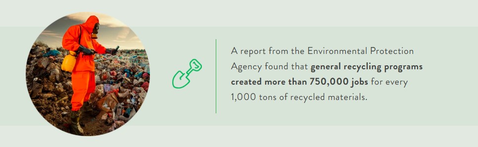 Los programas de reciclaje de residuos electrónicos ayudan a crear más puestos de trabajo. Un informe de la Agencia de Protección Ambiental encontró queLos programas generales de reciclaje crearon más de 750.000 puestos de trabajo.o alrededor de 1,5 puestos de trabajo por cada 1.000 toneladas de materiales reciclados. En el reciclaje de productos electrónicos, en 2016 se crearon entre 20.000 y 30.000 puestos de trabajo, lo que generó alrededor de mil millones de dólares en salarios.