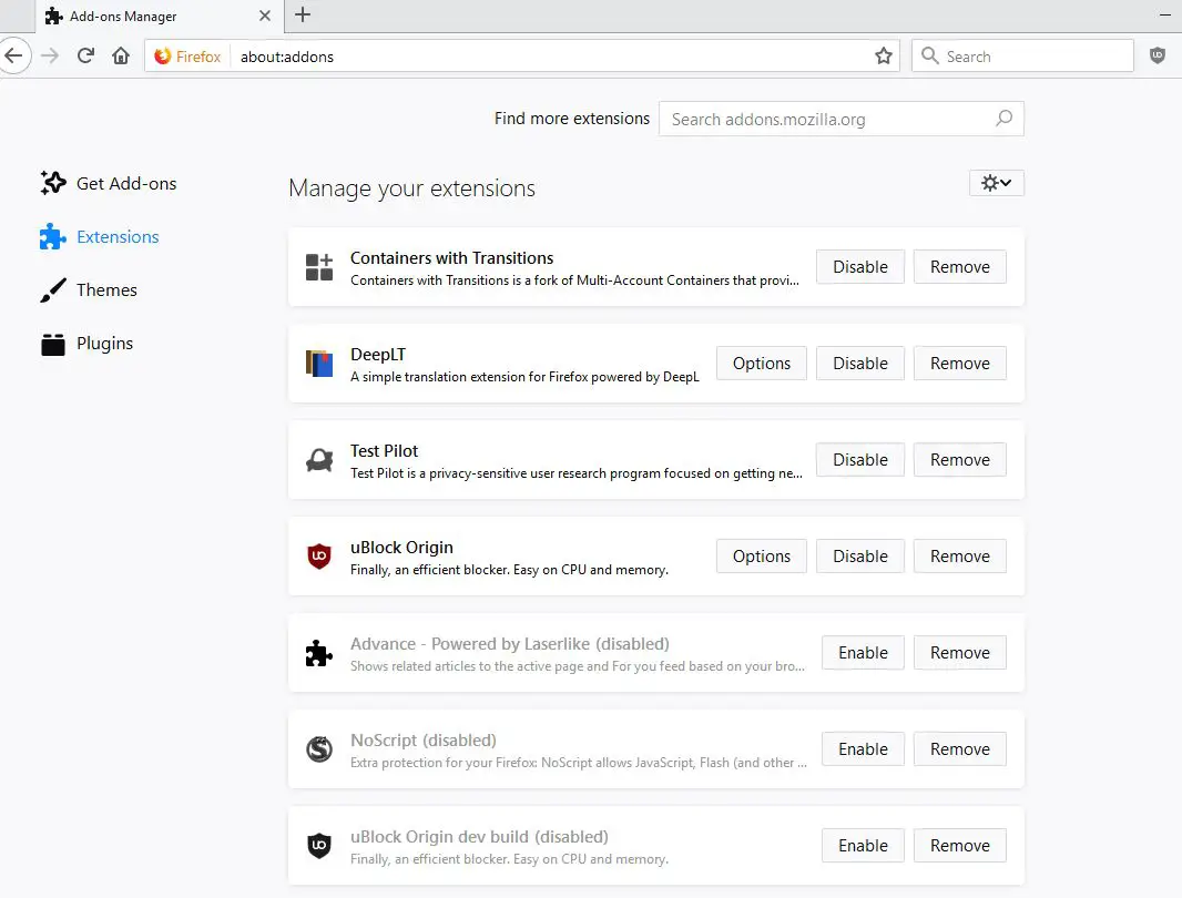 Esto mostrará una lista de extensiones habilitadas en su navegador. Vamos a desactivarlos todos, - Además, puede hacer clic en el ícono de tres puntos suspensivos al lado del botón de alternancia y seleccionar la opción de eliminar para eliminar la extensión del navegador Firefox.
