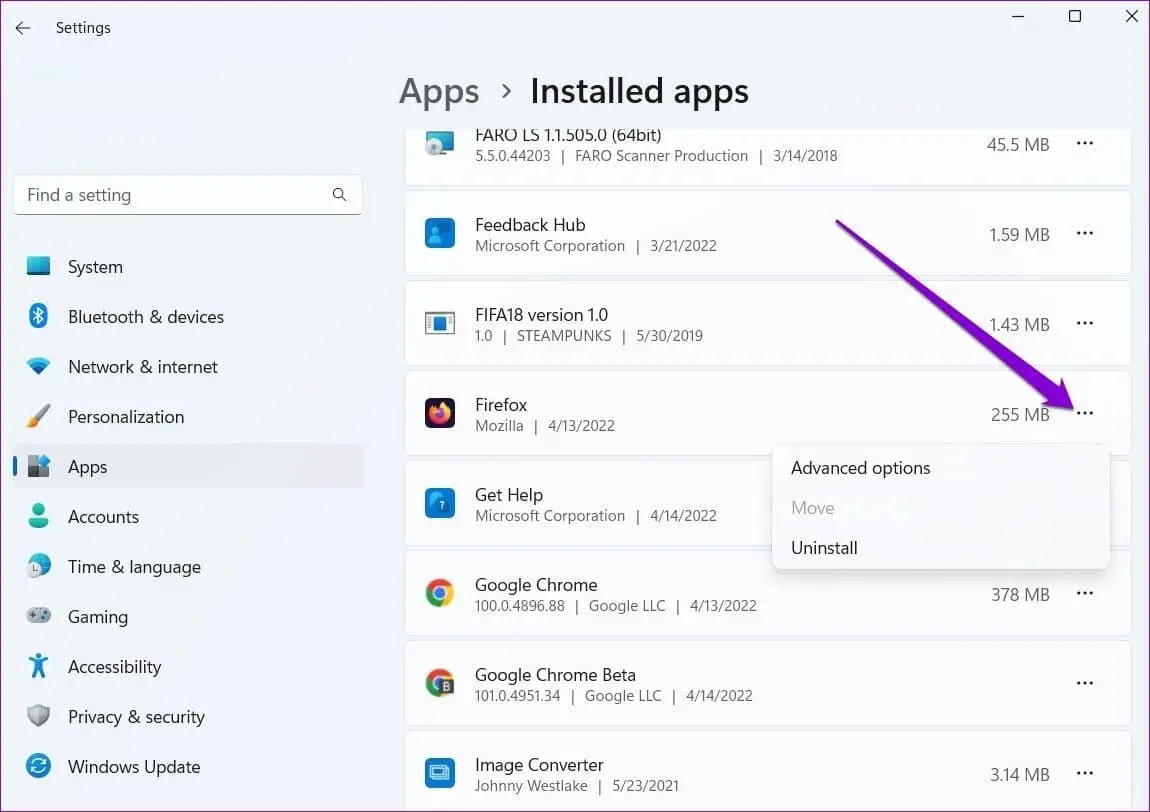 - Ubique Firefox en la lista, haga clic en el ícono de menú de tres puntos al lado de la aplicación y seleccione Opciones avanzadas.