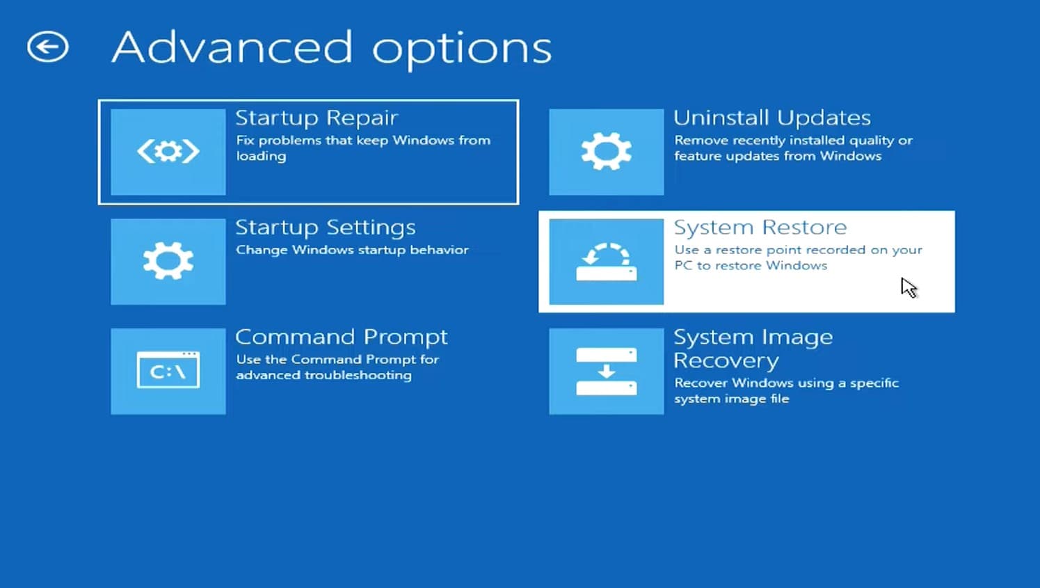 - Vaya a Opciones avanzadas > Solucionar problemas > Opciones avanzadas > Restaurar sistema.
