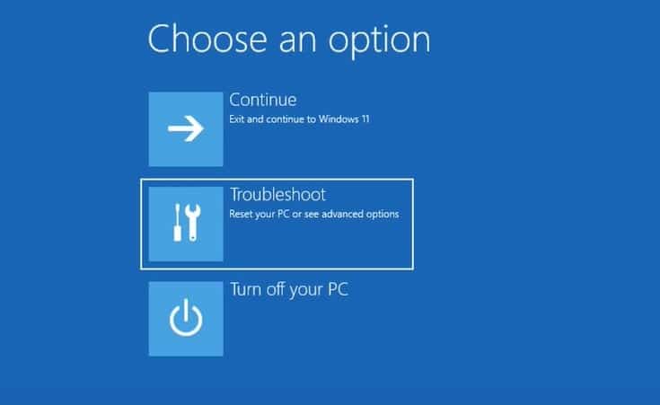 - Nuevamente, desde la pantalla de error, seleccione Opciones avanzadas,