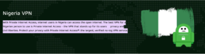 Sin embargo, el uso de una VPN no exime al usuario de la ley nigeriana. No se recomienda ninguna actividad en Internet prohibida por la ley nigeriana.