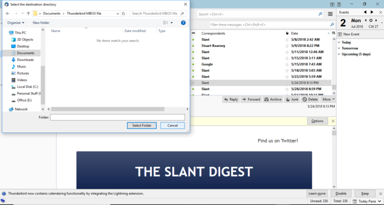 - Ahoraseleccione una carpetapara guardar correos electrónicos de Thunderbird y presione elSeleccionar carpetabotón.