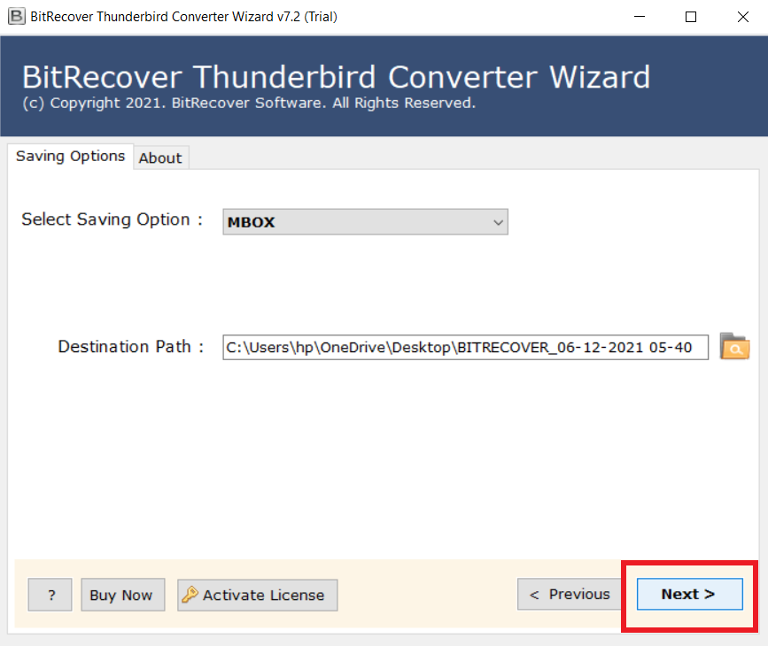 - Por último, presione el botón "Próximo”Icono para exportar el archivo MBOX desde Thunderbird.