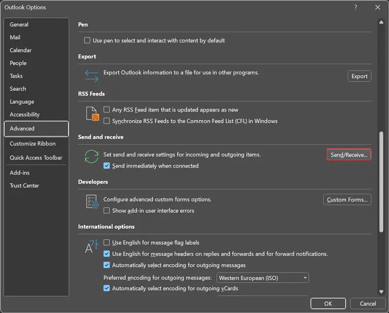 2. Presione Avanzado y toque la opción Enviar/Recibir.