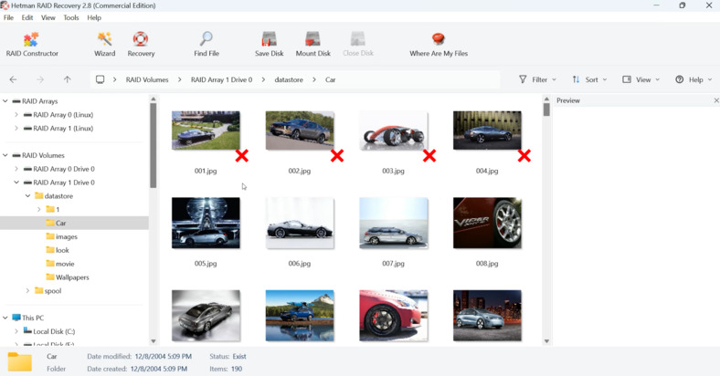 Como se muestra, el programa encontró fácilmente todos los archivos que quedaban en las unidades de matriz. También localizó datos eliminados, que están marcados con una cruz roja.