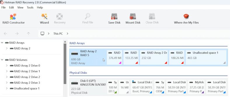 - Software especializado diseñado para la recuperación de datos de matrices RAID dañadas. Para esta guía usaremos el programa.Recuperación RAID de Hetman.