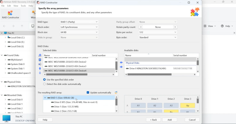 Una ventaja de Hetman RAID Recovery es que el programa intenta analizar los parámetros especificados en tiempo real. Si se ingresa correctamente, la información sobre su matriz y su sistema de archivos (XFS) puede aparecer debajo en la ventana del constructor. Si puedes ver la estructura del disco, ¡estás en el camino correcto!