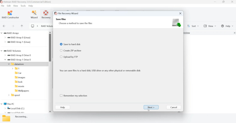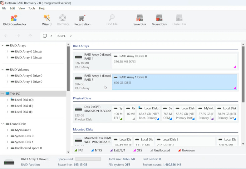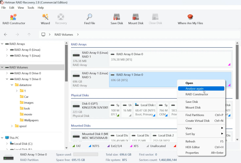 La regla principal en tales situaciones es no "experimentar" con las unidades y no iniciar la recreación de la matriz en el propio NAS, ya que esto puede dañar permanentemente los datos. El enfoque óptimo es quitar los discos duros, conectarlos a una computadora y utilizar soluciones especializadas comoRecuperación RAID de Hetman. Este software le permite recrear virtualmente elRAID 5estructura, lea elXFSsistema de archivos y restaurar el acceso a los archivos.
