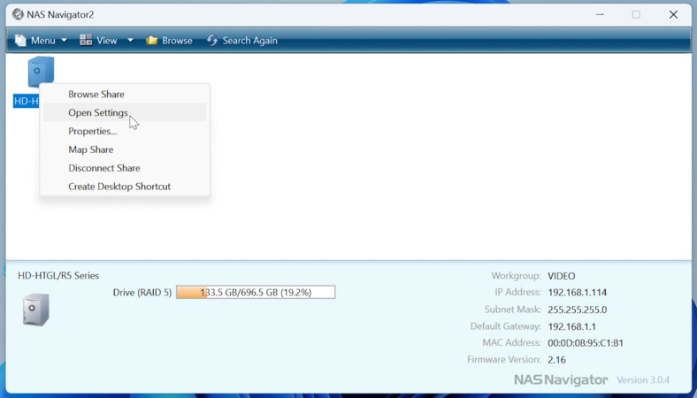 Para acceder al panel de administración de almacenamiento, inicieNavegador NAS, ubique el dispositivo en la lista y abra su configuración (haga clic derecho –Abrir configuración).