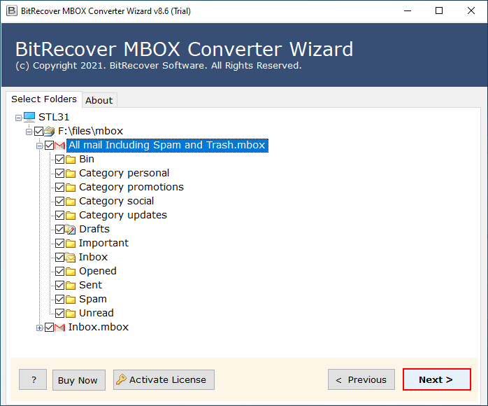 - A partir de entonces, habilite sólo elcarpetas requeridasdesde el panel de vista previa para iniciar el proceso de conversión del buzón de GyazMail a PST.