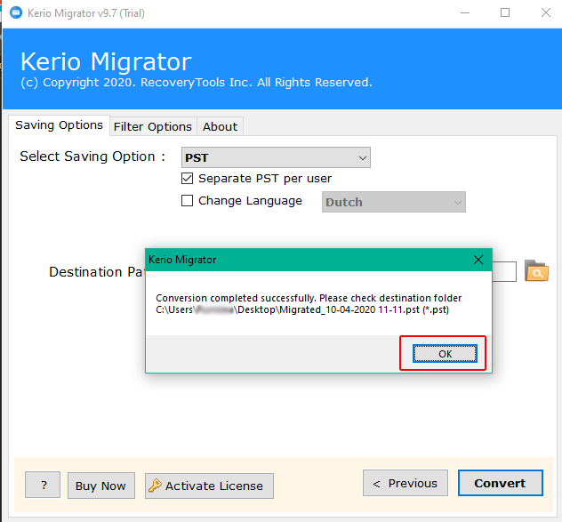 - Hacer clic enConvertirpestaña para comenzar la conversión de Kerio a Outlook.