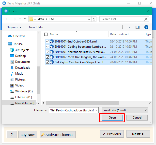(A) Seleccionar archivos:Si seleccionas esta opción, simplemente puedes cargar los correos electrónicos de Kerio todos a la vez.