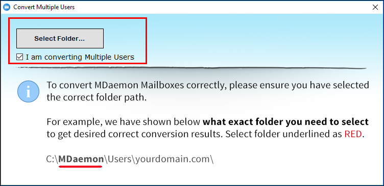 (b) Seleccionar carpetas:Si elige esta opción, puede cargar una carpeta que contenga los correos electrónicos de Kerio. La pantalla mostraráConvertir varios usuariosy habilite esta opción "Estoy convirtiendo varios usuarios".