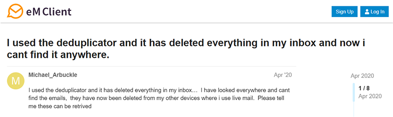 Sí, existe una forma manual de eliminar elementos duplicados de eM Client, pero no es completamente efectiva. Sus datos completos se pueden eliminar con la ayuda de esa forma manual. Esto sucedió con un usuario que realizó su consulta en el sitio web oficial de em client cuya captura de pantalla mencionamos a continuación y también el enlace.