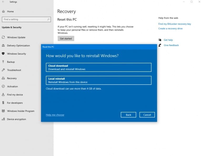 A continuación, debe elegir entre la descarga en la nube y la reinstalación local. Seleccione la opción de reinstalación local.