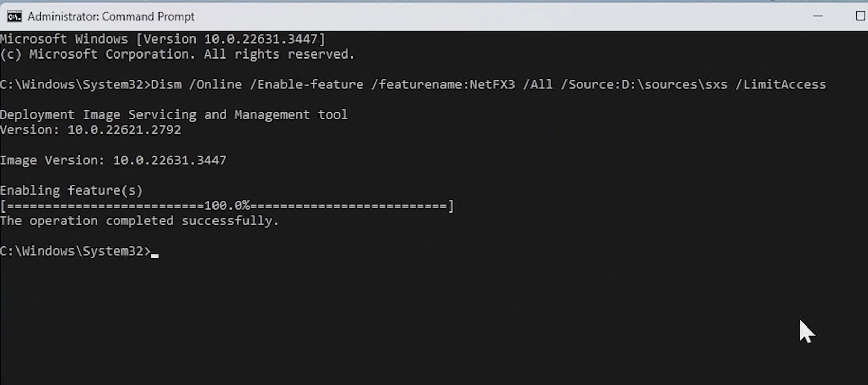 DISM /En línea /Activar-función /Nombre de característica:NetFx3 /Todos /Fuente:D:sourcessxs /LimitAccess
