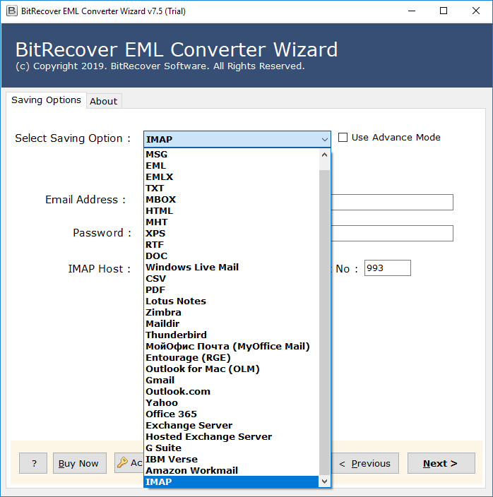 5.Hay muchas opciones de ahorro disponibles. Elija la opción IMAP para importar archivos EML en el menú desplegable.