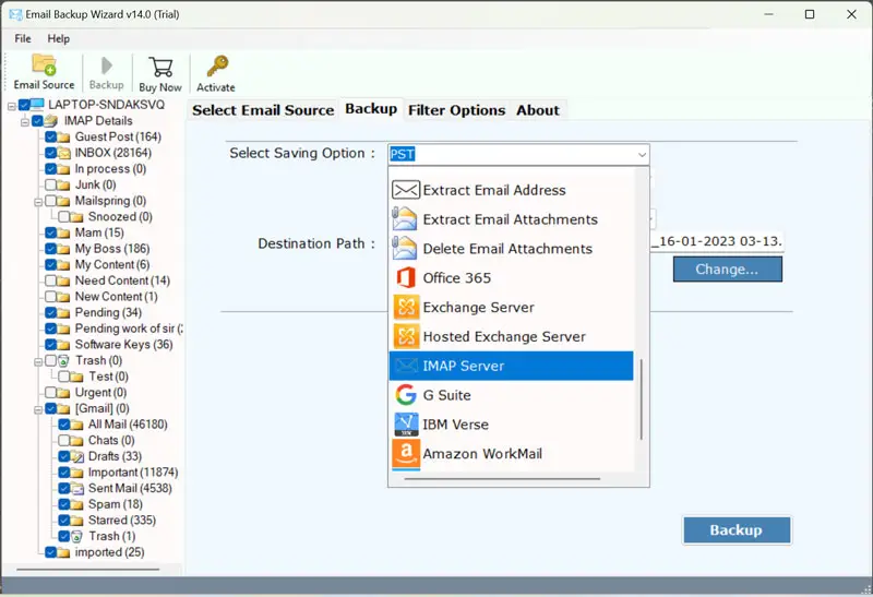 - Desde el botón Seleccionar opción de guardar, elija elServidor IMAPopción.