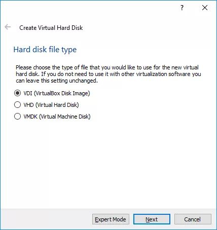 Un archivo VDI (VirtualBox Disk Image) funciona igual que un disco duro físico que puede almacenar cualquier tipo de información en todas las extensiones de archivo. Supongamos que si está utilizando 4 sistemas operativos Windows diferentes en una sola PC, creará 4 archivos VDI para almacenar los archivos de configuración y los datos del usuario. Al momento de crear una computadora virtual, los usuarios pueden elegir la extensión de archivo VDI para crear un disco duro virtual como se muestra en la captura de pantalla respectiva.