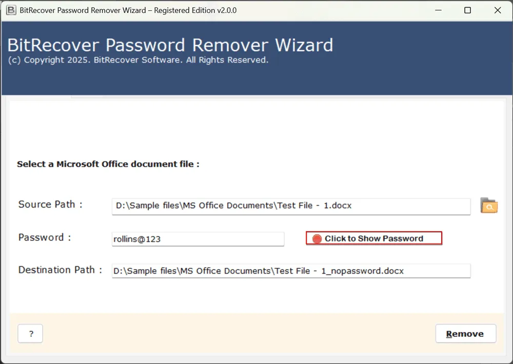 Si no quiere tener problemas con los pasos manuales o tener archivos PPT a granel, la mejor y más sencilla opción es utilizar una herramienta profesional, es decir.Eliminador de contraseñas de BitRecover Office. Es uno de los programas más recomendados para desbloquear la contraseña de PowerPoint al instante sin pérdida de datos. Es compatible con todas las versiones de Microsoft PowerPoint para permitir que todos los usuarios eliminen la contraseña de PPT con solo unos pocos clics. Este software le ofrecerá una experiencia sin complicaciones incluso si desea procesar por lotes varias presentaciones.