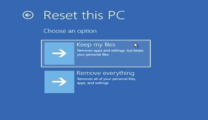 A continuación, elija la opción Conservar mis archivos y siga las instrucciones en pantalla para restablecer Windows 10 a los valores predeterminados de fábrica.