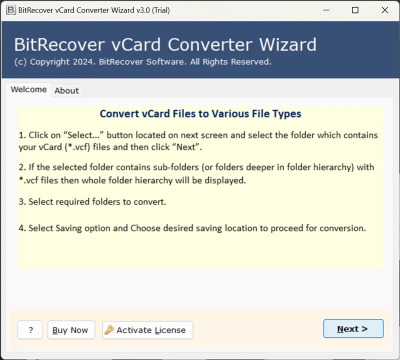 Este software vCard Splitter admite las versiones vCard 2.1, 3.0 y 4.0 y divide rápidamente archivos VCF en contactos individuales. La herramienta también mantiene información completa de contacto vCard durante la división de contactos VCF. Simplemente descargue este VCF Splitter y pruébelo sin costo alguno.
