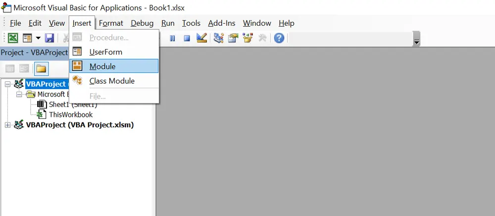 - Ahora, haga clic en Insertar y elija la opción Módulo de la lista desplegable.