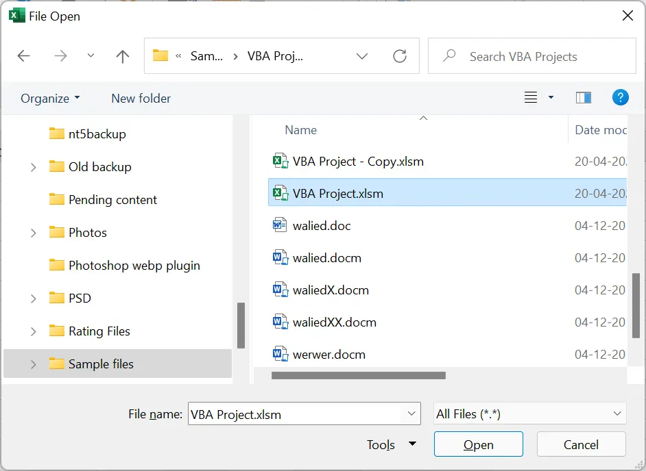 - Seleccione el proyecto VBA de Excel protegido con contraseña desde su computadora. Presione el botón Abrir para completar este paso.