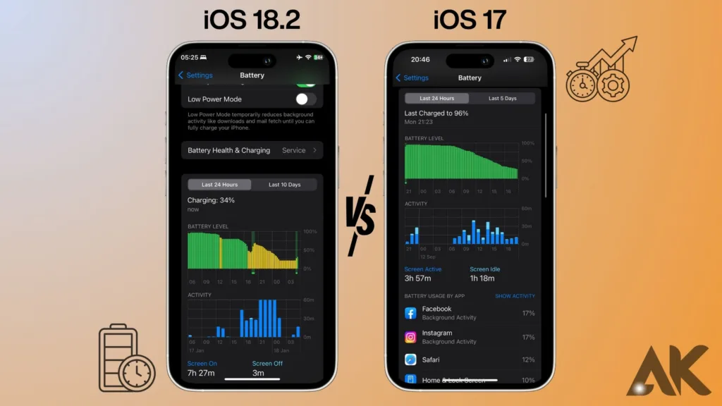 iOS 18.2 vs iOS 17 La duración de la batería es una de las consideraciones más importantes para los usuarios de dispositivos móviles, por lo que Apple ha realizado avances significativos en [iOS 18.2] sobre la administración de energía. Una de las principales ventajas de [iOS 18.2] frente a [iOS 17] es la inclusión del uso adaptativo de la batería. Esta herramienta maximiza los procesos en segundo plano para ahorrar energía al realizar un seguimiento inteligente de cómo usa su teléfono inteligente. Las aplicaciones que rara vez se utilizan, por ejemplo, perderán prioridad y consumirán menos energía cuando estén inactivas. Esta mejora garantiza que, especialmente en el modo de espera donde [iOS 18.2] brilla por encima de [iOS 17], puedas pasar el día sin tener que cargar con tanta frecuencia.
