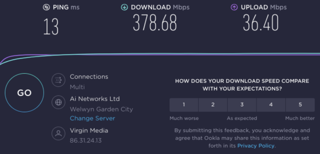 Como sospechaba, las velocidades mejoraron enormemente, aumentando hasta exactamente 234 Mbps. No es el mejor en comparación con los 378 Mbps básicos, pero aún así equivale aproximadamente al 60%. El ping casi se había duplicado, pero aún así era un buen resultado.
