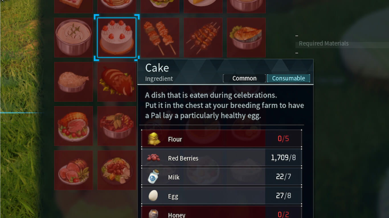 Sin el pastel Palworld Breeding, los huevos de los amigos no eclosionarán. Los ingredientes necesarios para hacer el pastel incluyen huevos, miel, leche, harina y frutos rojos silvestres. Asegúrese de tener estos ingredientes para hacer el pastel con éxito y hacer que la granja de cría funcione correctamente.