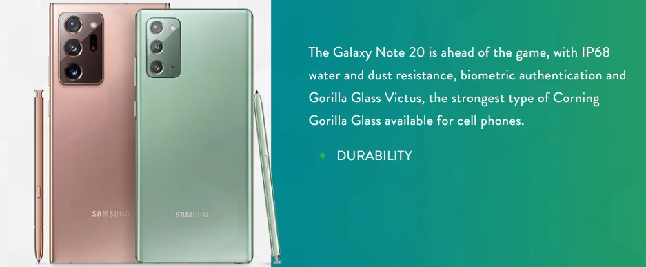 El Galaxy Note 20 está a la vanguardia, con resistencia al agua y al polvo IP68, autenticación biométrica y Gorilla Glass Victus, el tipo de Corning Gorilla Glass más resistente disponible para teléfonos móviles.En una prueba de fuerza, la pantalla resistió 11 caídas separadas boca abajo desde 5 pies y escapó sin un rasguño. Los nuevos Galaxy Notes también vienen equipados con Samsung Knox, un sistema de seguridad por capas integrado que puede proteger contra manipulación, exposición de datos y otros peligros.