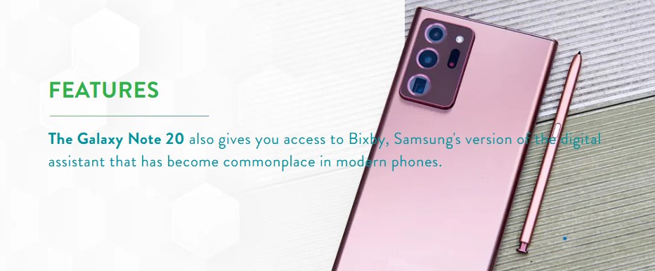 El Galaxy Note 20 también te da acceso a Bixby, la versión de Samsung del asistente digital que se ha vuelto común en los teléfonos modernos. Bixby puede ayudartetoma el control de tu dispositivoen todas las formas típicas de asistente, como configurar recordatorios y programar eventos del calendario por usted, pero también puede usar funciones adicionales para una máxima eficiencia. Bixby Routines le permite a su Note aprender sus patrones y hacer recomendaciones basadas en sus rutinas existentes. Por ejemplo, si normalmente te acuestas alrededor de las 11 p.m., Bixby puede aprender a reducir automáticamente la luz azul y el brillo de la pantalla alrededor de esa hora cada noche. Bixby puede ayudarte a tomar fotografías y habilitar funciones de accesibilidad. Incluso puedes sincronizar tu asistente móvil con tus otros dispositivos Samsung, incluidos televisores y luces Samsung, para tener un hogar totalmente integrado.