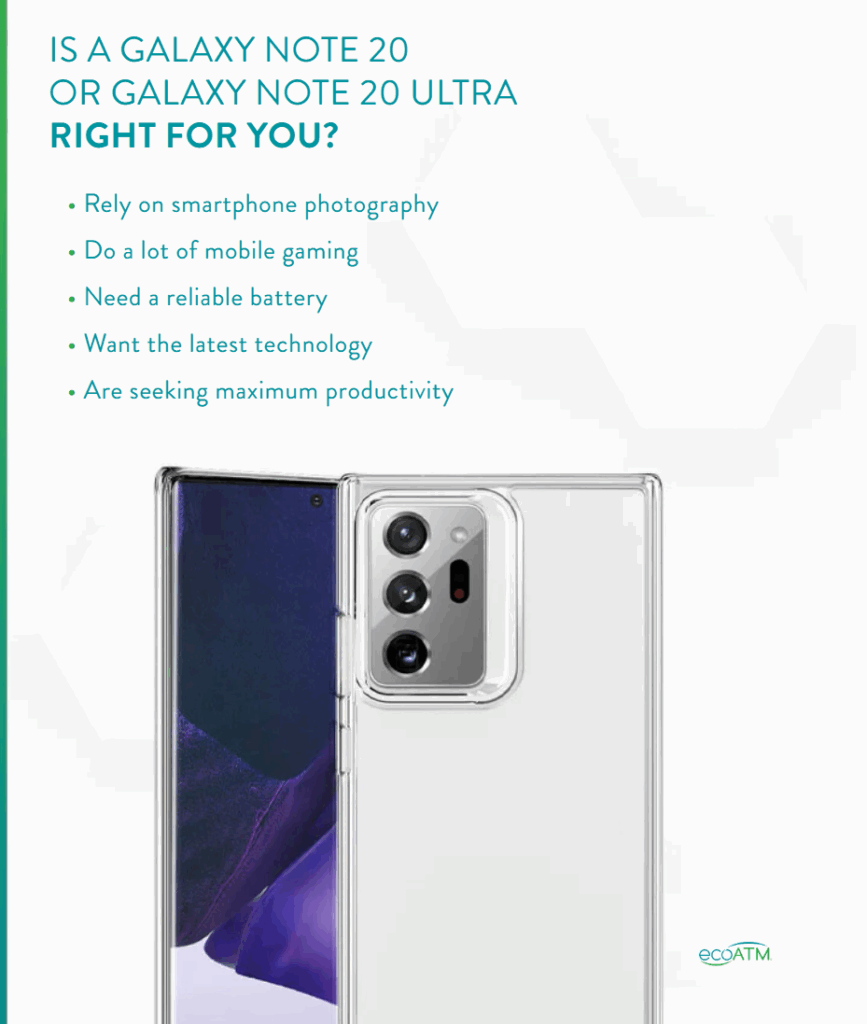 Ya sea que elija actualizar al Galaxy Note 20 u optar por el 20 Ultra, ecoATM está aquí para ayudarlo a reciclar su dispositivo anterior. Elel proceso es fácil— simplemente reinicie su teléfono actual, busque unQuiosco ecoATM cerca de ustedy le cambiaremos dinero en efectivo por su antiguo teléfono inteligente. Esto significa menos desechos electrónicos dañinos para nuestro medio ambiente y más dinero para tu nuevo Note. Explore nuestro sitio web para obtener más información sobre cómo el comercio de su dispositivo puedehacer un gran impactoen el mundo que te rodea.