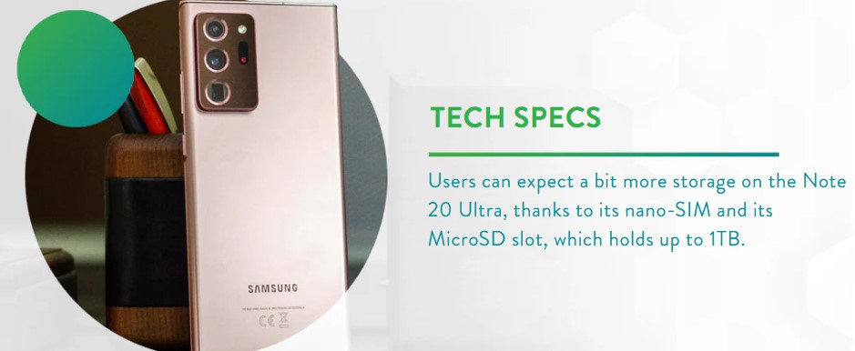Los usuarios pueden esperar un poco más de almacenamiento en el Note 20 Ultra, gracias a su nano-SIM y su ranura MicroSD, con capacidad para hasta 1 TB. El almacenamiento interno incluye 512 GB o 128 GB, cada uno con 12 GB de RAM. En lugar de una pantalla plana, el 20 Ultra incluye una pantalla Edge Infinity-O con HDR10+, esta vez con Dynamic AMOLED 2X, que brinda colores nítidos y una experiencia de visualización similar a la de un cine.