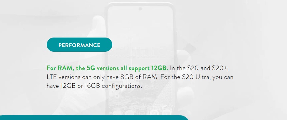 En cuanto a RAM, todas las versiones 5G admiten 12 GB. En el S20 y S20+, las versiones LTE sólo pueden tener 8 GB de RAM. Para el S20 Ultra, puede tener configuraciones de 12 GB o 16 GB.
