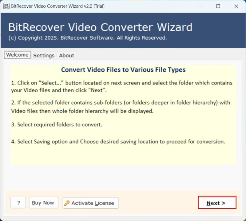 Entonces estás decepcionado con las técnicas manuales. ¡Esto es lo que puedes hacer! puedes intentarloAsistente de conversión de vídeo BitRecover. Esta herramienta hace que las cosas sean bastante sencillas para usted. A diferencia de los arriesgados trucos manuales, esta herramienta garantiza resultados precisos sin esfuerzo.