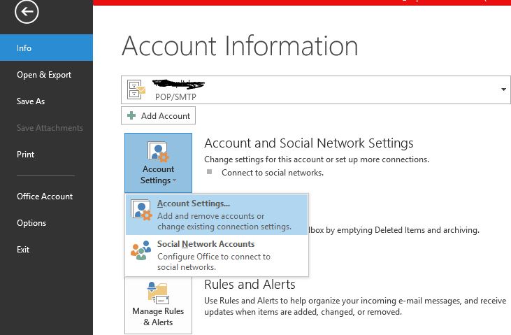 - Abre tucuenta de Outlooky vaya al menú Herramientas. Si está utilizando Office 2013/16, vaya aArchivo>Configuración de cuenta>Configuración de cuenta.