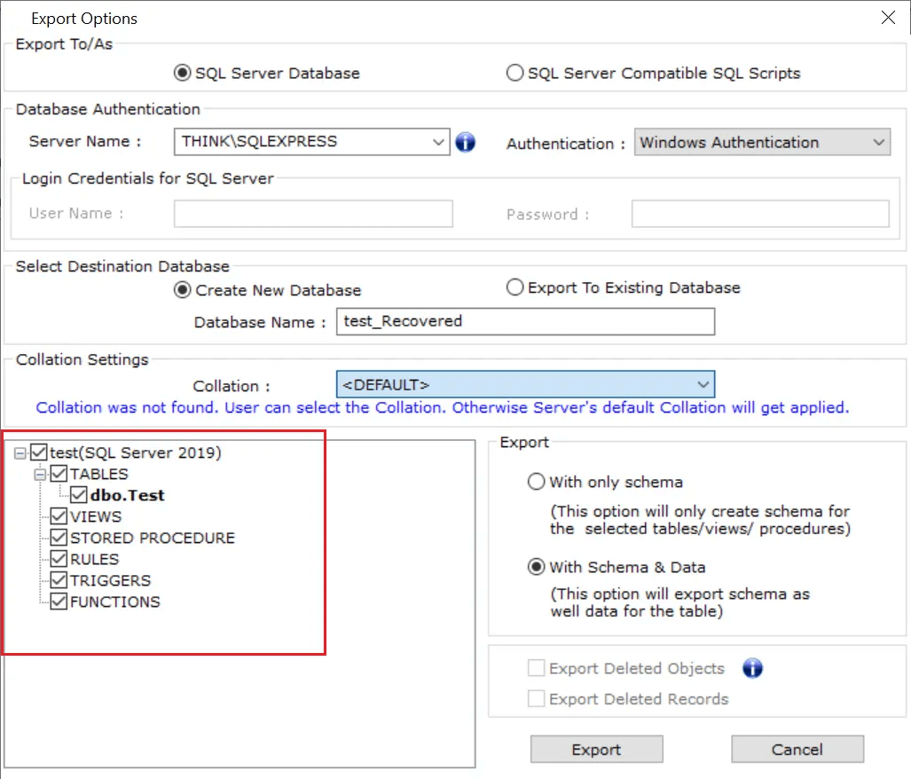 - Haga clic en elBotón exportaryagregue los detalles de autenticaciónde la versión de SQL Server deseada.