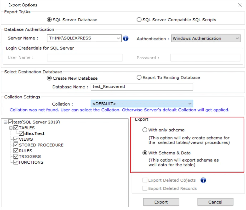- Haga clic en el botón Exportardespués de seleccionar la opción Exportar con esquema y datos para finalizar el proceso de migración.