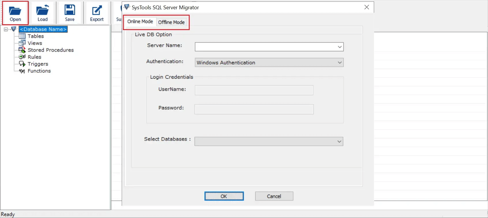 - Instalar y ejecutarla herramienta de migración de bases de datos. Haga clic en el botón Abrir para abrir archivos de base de datos.