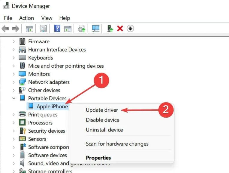 - Expanda dispositivos portátiles, haga clic derecho en su iPhone y luego haga clic en Actualizar controlador.