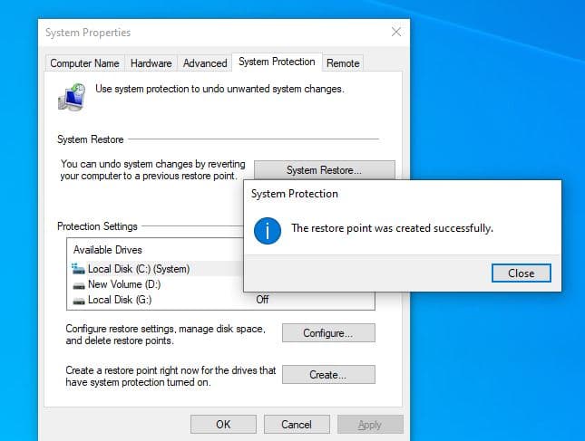 - Espere a que se cree el punto de restauración. Esto puede tardar unos minutos.