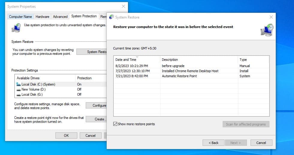 Esta función es como una copia de seguridad, pero no exactamente, ya que retroceder en el tiempo con esta función no afectará sus documentos o configuraciones antes de la creación de un punto de restauración en particular. Sin embargo, eliminará aplicaciones, controladores, actualizaciones del sistema y cambios de registro después de crear el punto de restauración.Es como una máquina del tiempo.