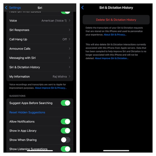 - Por lo tanto, borre el historial de Siri y comience de nuevo yendo alAplicación de configuración> Siri> Siri e historial de dictado> Eliminar Siri e historial de dictadoy confirme la limpieza.