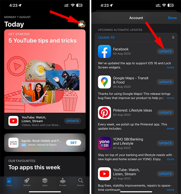 - Para actualizar esas aplicaciones, inicie la aplicación App Store y toque su perfil en la parte superior derecha. Desplázate para encontrar tu aplicación y presiona el botón Actualizar justo al lado.