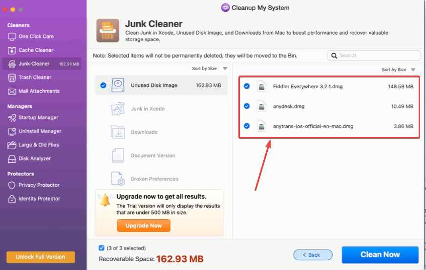 Para deshacerse de las imágenes de disco no utilizadas de las aplicaciones instaladas, puede utilizar una aplicación como Cleanup My System. Es una aplicación que puede añadir años a la vida útil de tu Mac mejorando su rendimiento y acelerándolo. Ha demostrado ser eficaz para solucionar problemas como"Disco de inicio casi lleno".