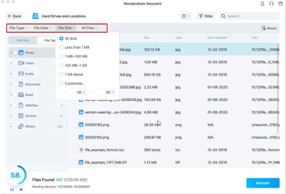 Supongamos que eliminó un archivo DMG incorrecto, por ejemplo, un archivo DMG de una aplicación que aún no había instalado o en la que aún no había trabajado. ¿Cómo lo recuperarías? Puedes usar una herramienta de recuperación de datos como Wondershare Recoverit para Mac y restaurar un archivo DMG eliminado accidentalmente. ¿Cómo recuperar un archivo DMG perdido usando Wondershare Recoverit? 1. Descarga, instala y ejecuta Wondershare Recoverit en tu Mac. 2. Escanee la ubicación. En cualquier momento, si encuentra su archivo DMG perdido, puede pausar el proceso de escaneo. 3. Incluso puedes filtrar archivos.