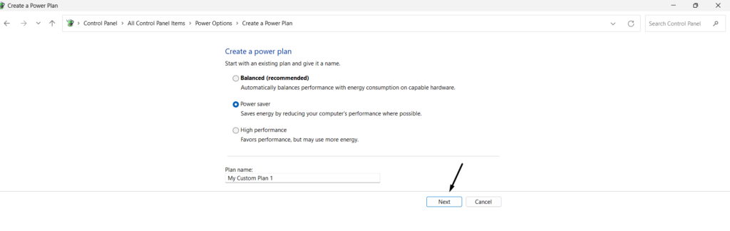 5.Después de crear un plan de energía, se activará y ahorrará energía de la batería de su PC con Windows 11.